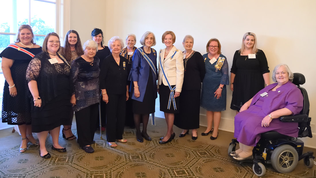 Back row, left of, Center L to R, Lauren Pourciau brought greetings from Alexander Stirling Ch DAR (ASC-DAR), Laura Dunlap John James Audubon Ch DAR (JJA-DAR), Erah Harper, brought greeting from Heirome Gaines Ch DAR (HG-DAR), Ann Bergeron HG-DAR.  Front row L to R, Britney Kean brought greetings from HG-DAR, Shirley Newsham JJA-DAR, Mary Edna Rose JJA-DAR, Zora Olsson Past Vice-President General brought greetings from NSDAR Baton Rouge DAR, Cheryl Gott LSDAR State Regent, brought greetings from LSDAR, and a member of the Louisiana Bayou Chapter, Denise Lindsly JJA-DAR, Margaret Tyler JJA-DAR, Julie Noland JJA-DAR, and Jan Sauls JJA-DAR.