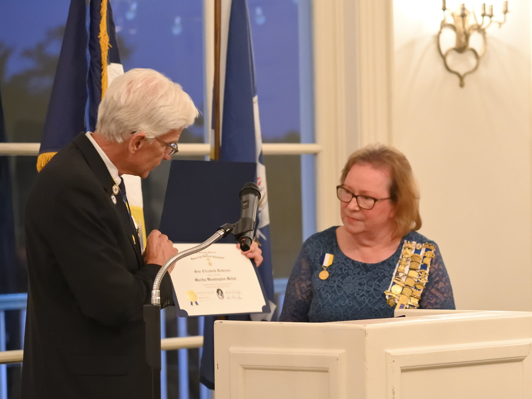 5) GPT President Mitch Pratt is showing presenting the Martha Washington Medal for Sue Badeaux, who was unable to attend the Banquet, to her fellow member and past Regent of John James Audubon Chapter of DAR, Margaret Tyler LSDAR Senior VP who is accepting the Medal and Certificate for Sue.  This award was made to recognize the years of work as a Leader from the John James Audubon Chapter of DAR for the Ann Fairfax Society of CAR in Louisiana.  Her dedication and support for the CAR has developed many young men for membership in the General Philemon Thomas Chapter of both junior and senior members. Margaret thanked GPT on Sue’s behalf.
