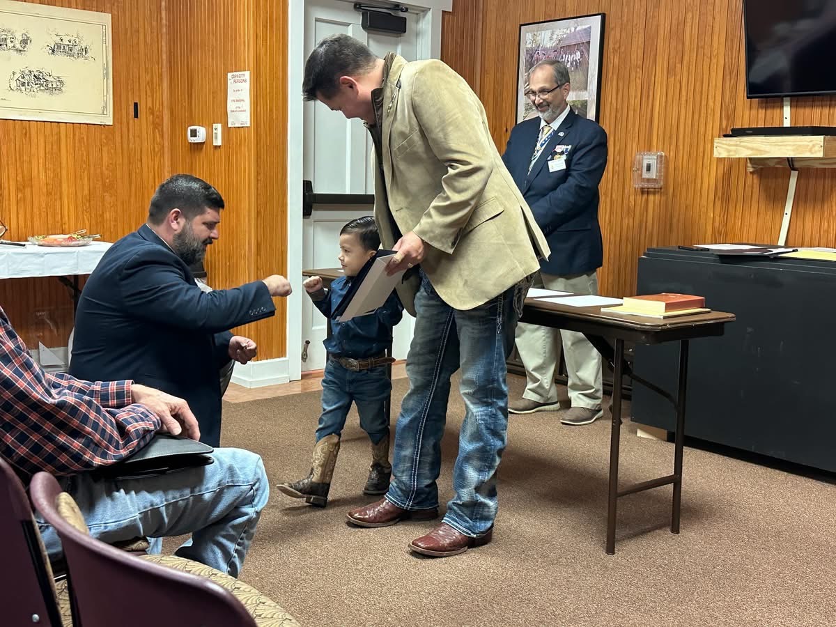 Compatriot Spencer Creech as he receives his SAR membership certificate from LASSAR President Jeffrey Nolen. From Left to right -Steve Creech, Spencer Creech, Jeffrey Nolen LASSAR President, and Jerry Madden.