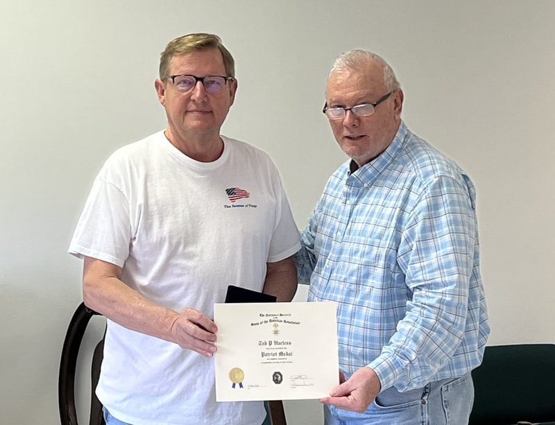 LA SAR President Jeff Nolen, presents the Patriot Medal to Compatriot Ted Harless during the Oliver Pollock Chapter meeting on 3-11-2023. The Patriot Medal is awarded only by a state society. It is the highest award given for service at the state or chapter level. This medal is presented only to individuals and may be received ONLY once. It represents long, faithful and outstanding service at the state and/or chapter level. From left to right, Compatriot Ted Harless and President Jeff Nolen.