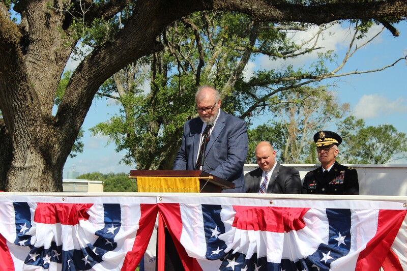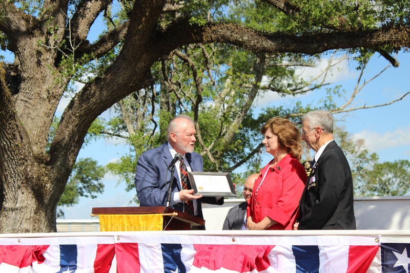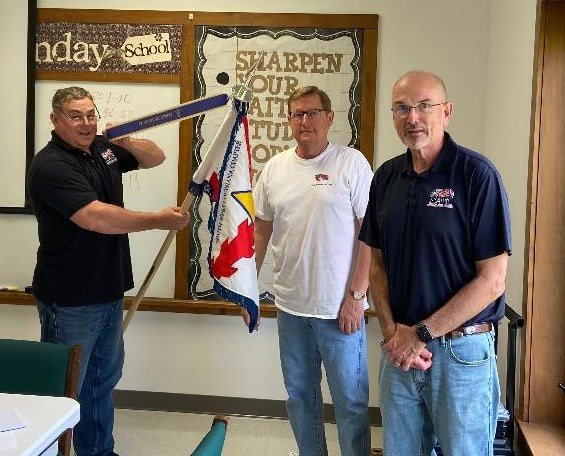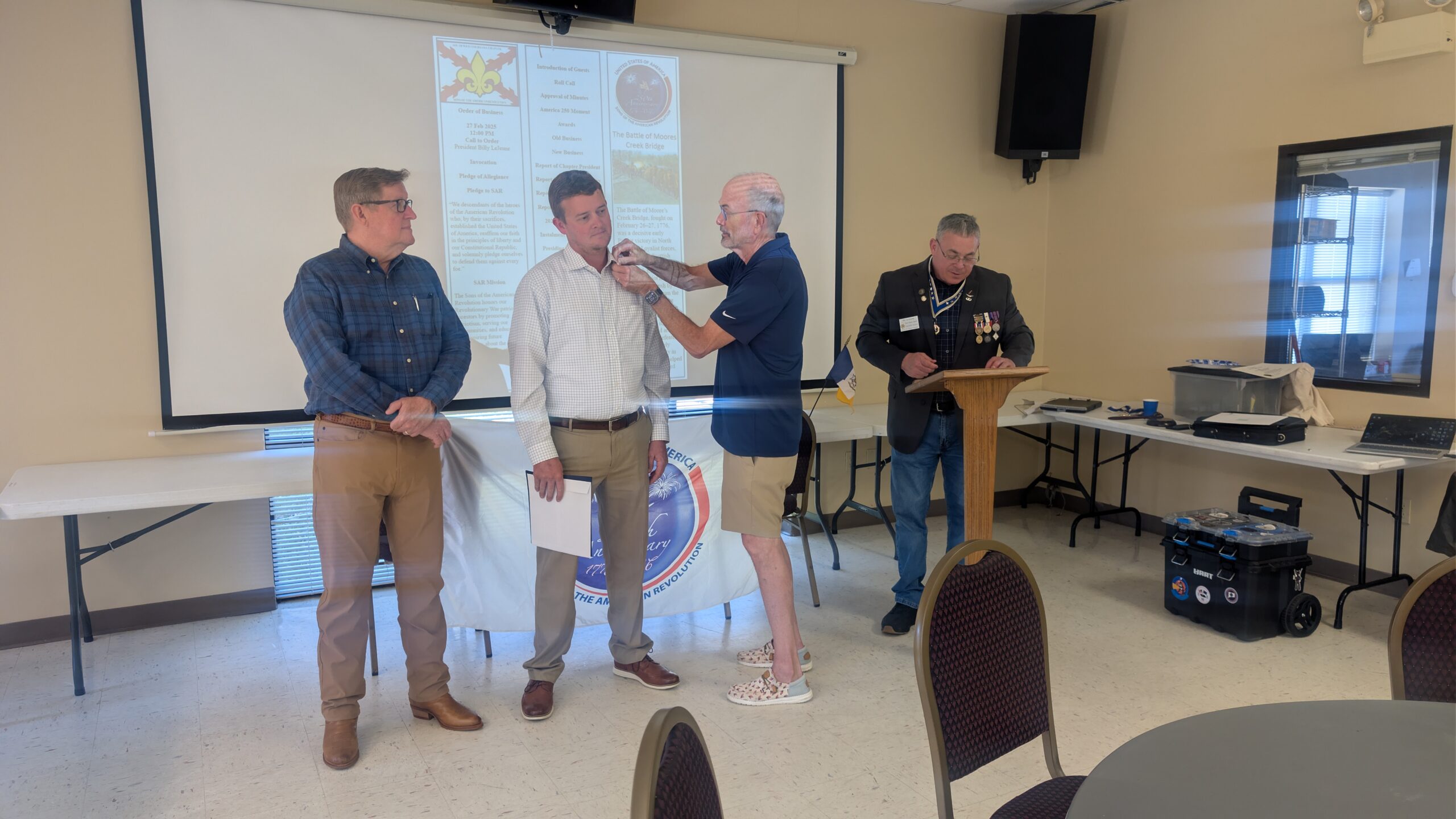 From left to right, Secretary Billy LeJune, Compatriot Ted Harless and President Russ Godwin, Compatriot Ted Harless and Secretary Billy LeJune placing the 250th Streamer on the Oliver Pollock Chapter Guidon.