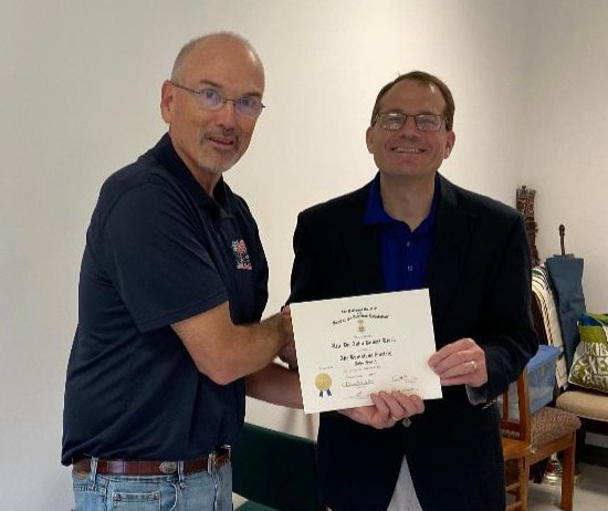 New member Compatriot Dr. John Robert Black being presented his certificate as a new Oliver Pollock (LA SAR) member. His ancestor is Patriot John Swint