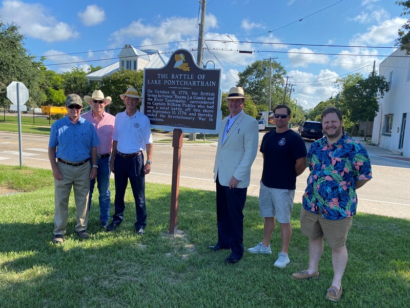 Perrie Georges Rousseau Chapter of the SAR, Perrie de Mandeville Chapter of the DAR and, The City of Mandeville gathered at the intersection of Lakeshore Dr and Girod St., in Mandeville to rededicate the historical marker commemorating the Battle of Lake Pontchartrain. The marker was damaged during Hurricane Ida. Mr. Gary Songy was contacted to repaint the marker.