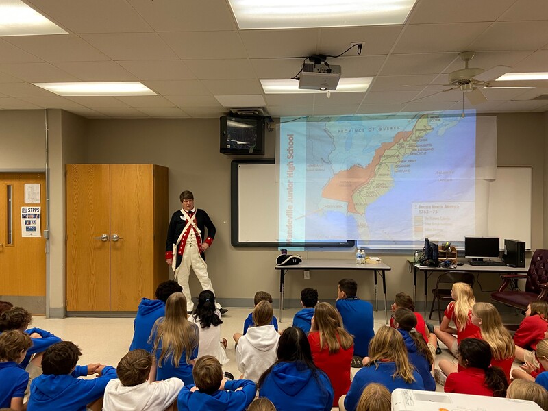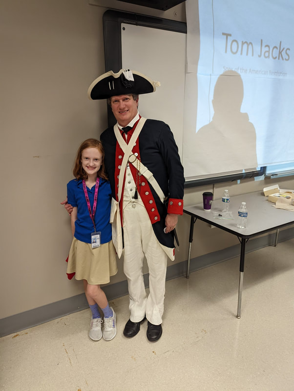 Tom Jacks, SAR Minuteman Award recipient and member of the Pierre Georges Rousseau Chapter, leads a lesson of the American Revolution at Mandeville Junior High, while depicting his ancestor’s uniform of the Virginia Continental Line. His lovely young daughter, Kathleen, was proud and excited of her father’s service to the community.